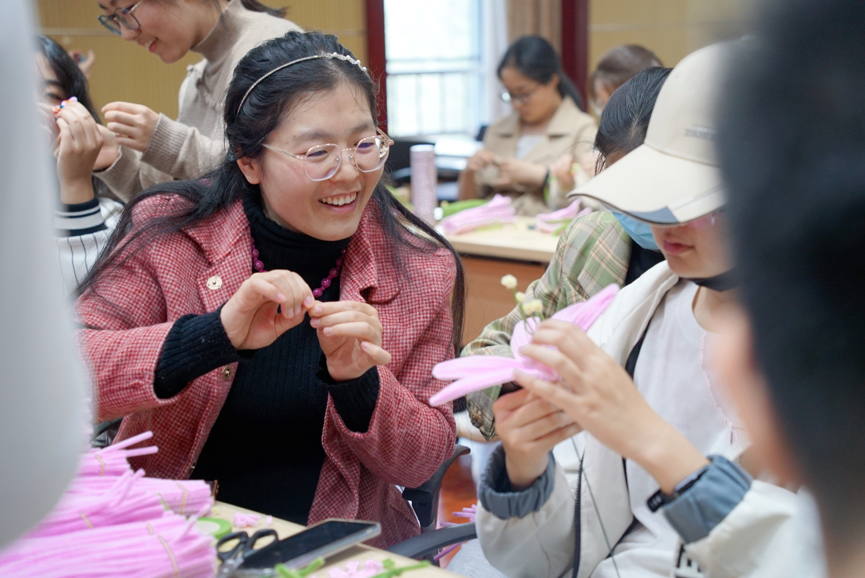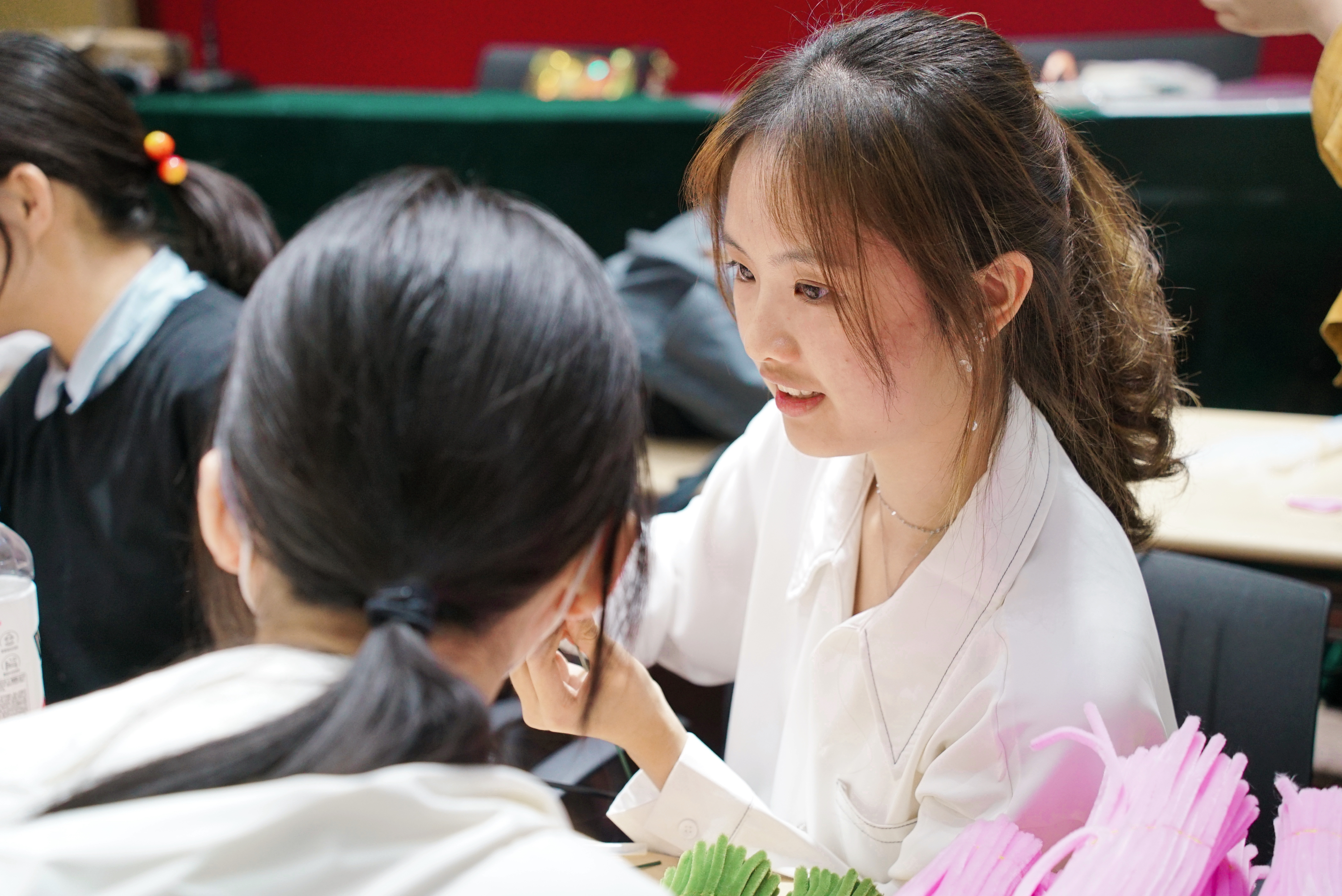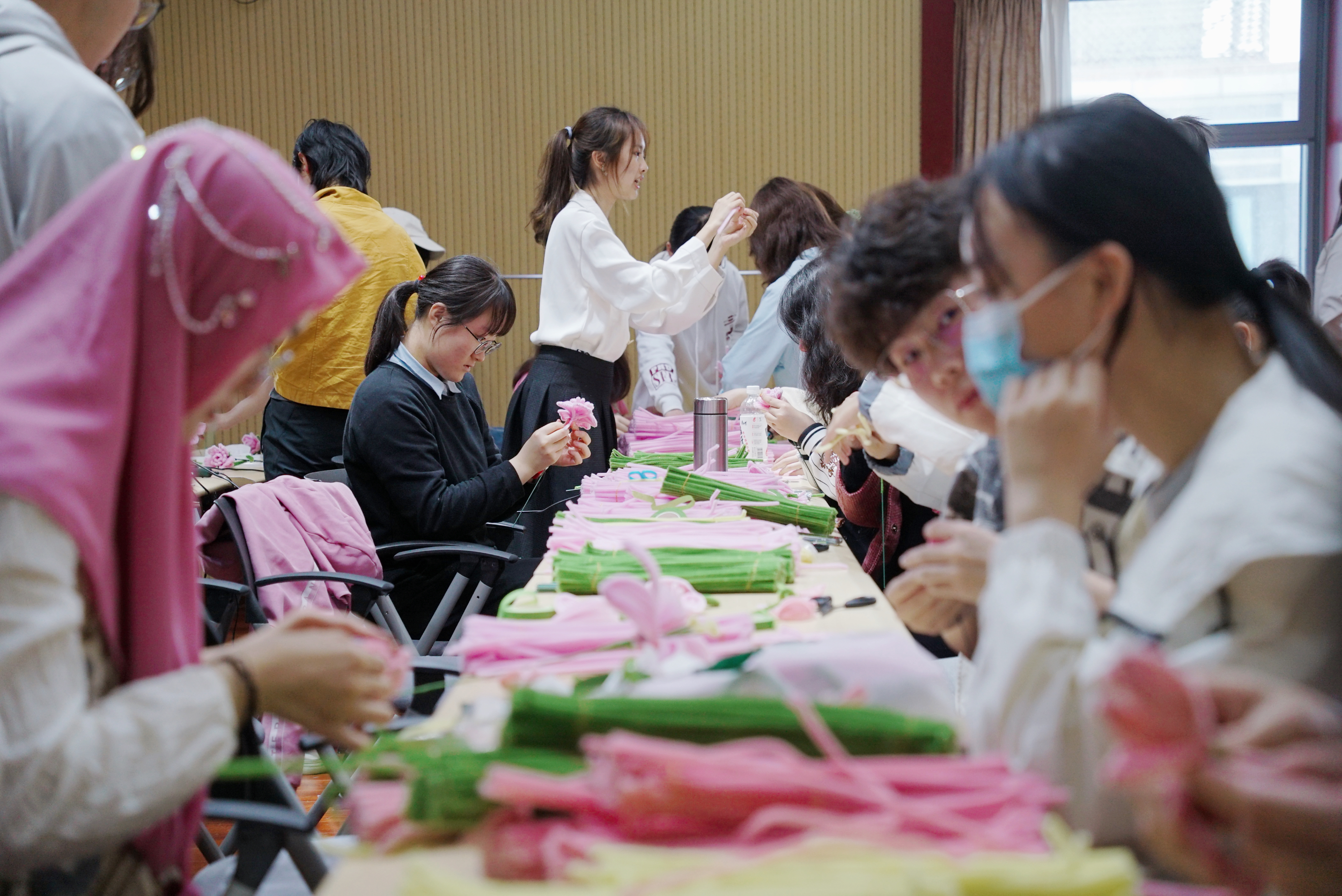 活动开始前,志愿者们在桌上摆放好手工花制作的各项材料,并贴心附上了制作教程。活动开始,在志愿者耐心的教导下,参与者们把一根根扭扭棒变成一朵朵在指尖绽放的鲜花。同学们在活动中有说有笑,有的同学心灵手巧,迅速完成了好几朵样式不同的花朵;有的同学在制作过程中好奇其他国家关于母亲节的文化;有的同学还讨论起自己所学专业的母亲节祝福的语法。