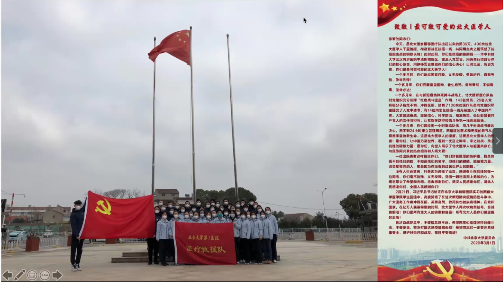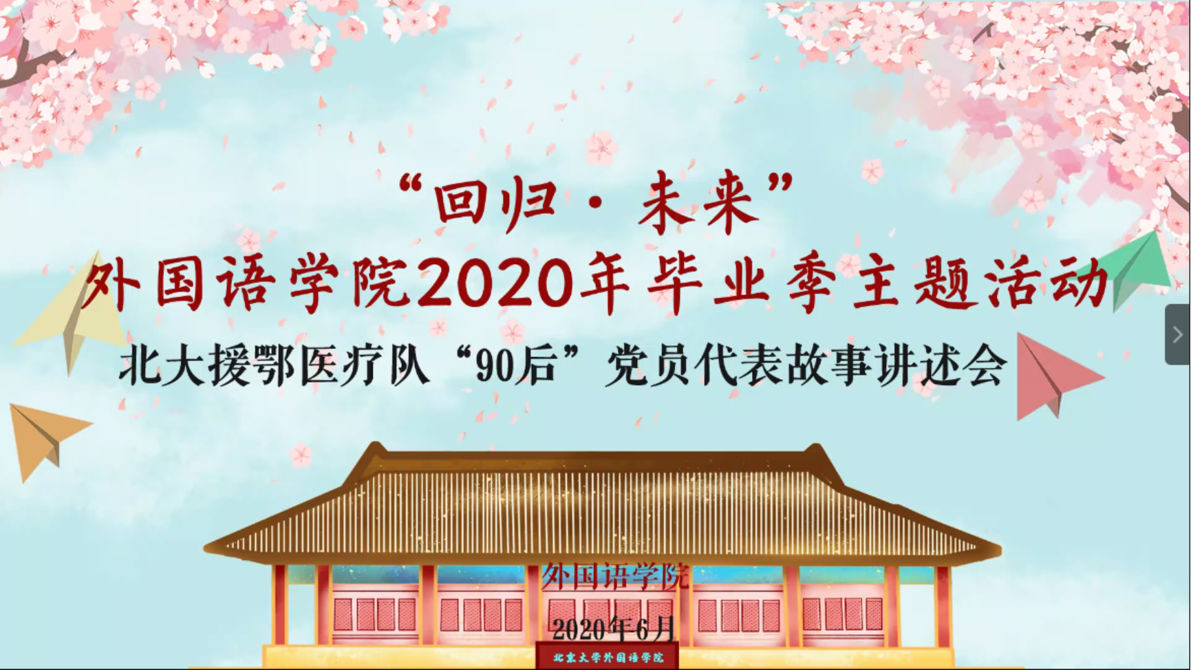 ​       6月23日晚,星空体育入口_星空(中国)体育网通过线上的方式举办了“回归·未来”星空体育入口_星空(中国)体育网2020年毕业季主题活动,给毕业生们上了毕业的最后一节公开课。会上特别邀请到北京大学援鄂医疗队“90后”党员代表、北医三院医务处庄昱老师分享他在援鄂期间的经历,以及习总书记回信背后的故事。星空体育入口_星空(中国)体育网党委书记李淑静老师、党委副书记王恒老师,以及毕业年级、非毕业年级的同学们共同参加了此次活动。活动由星空体育入口_星空(中国)体育网团委书记卢敏老师主持。