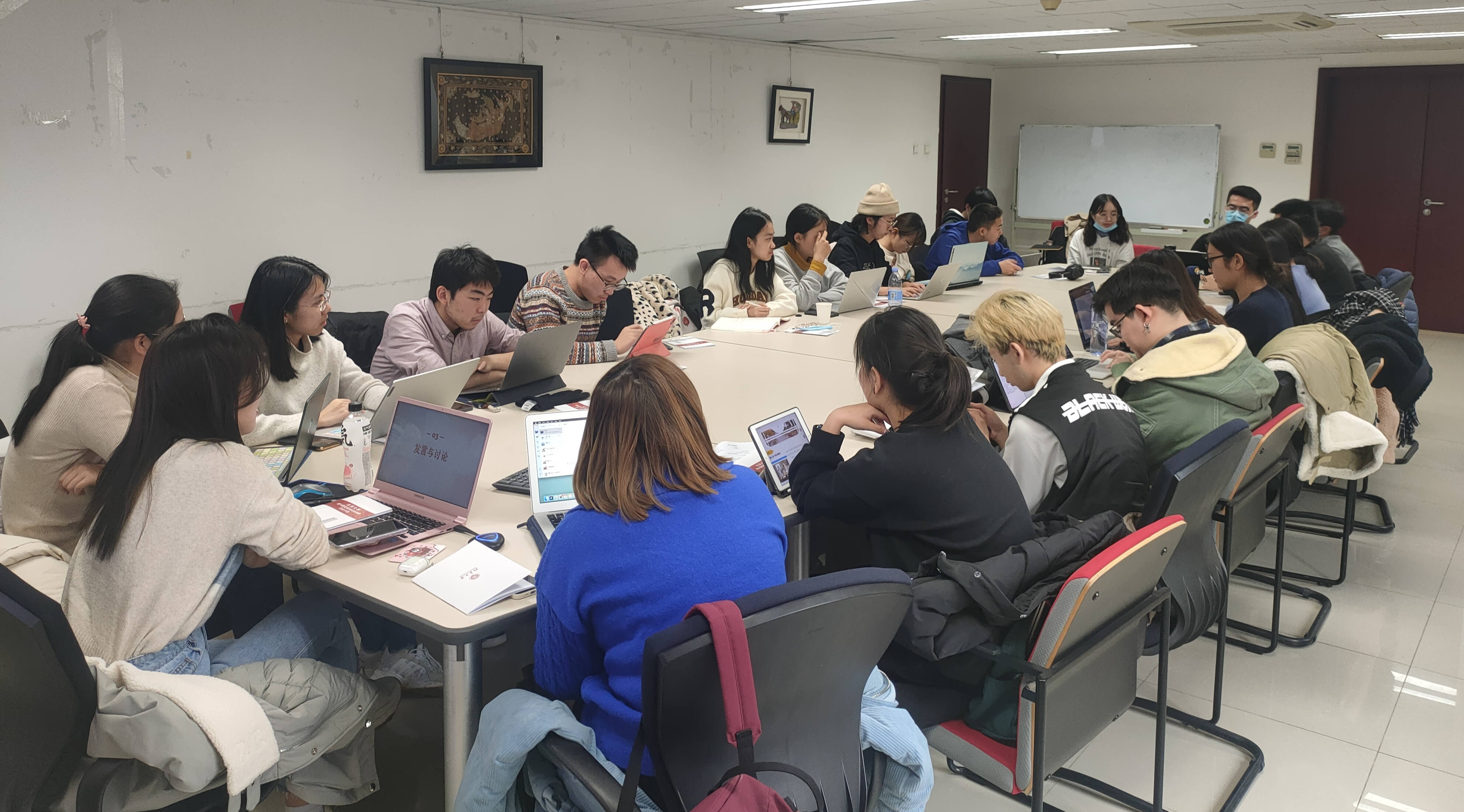 12月3日下午,第一小组在外文楼206会议室开展了主题为“从十九届六中全会,看新时代文化建设”的集体讨论会,由小组长周卓翔和余美伦担任主持。首先,周卓翔同学带领组员们回顾了全会中关于新时代文化建设的五个要点。其次,组员们集体观看了关于“中国文化史年表”的宣传片,回溯了中国自先秦以来的文化大事件,深刻体悟到了中华文化的源远流长、博大精深。最后,在余美伦同学的主持下,组员们轮流发言,分享自己关于新时代文化建设方面的所思所想。有组员根据实际出发,以家乡为例探讨了地方层面文化宣传的优秀案例;也有组员从小切口入手,聚焦昆曲等传统文化保护的例子,具体地分析了优秀传统文化面临的困境与可能有效的方案;更有组员融入时代新兴元素,创意性地提出利用自媒体平台、采用VR技术等方法来助力新时代的文化建设。本次讨论的内容多样、见解深刻,组员们表示对主题有了更深入的了解,希望未来能将外语专业的知识融入文化宣传,共同助力新时代文化建设。
