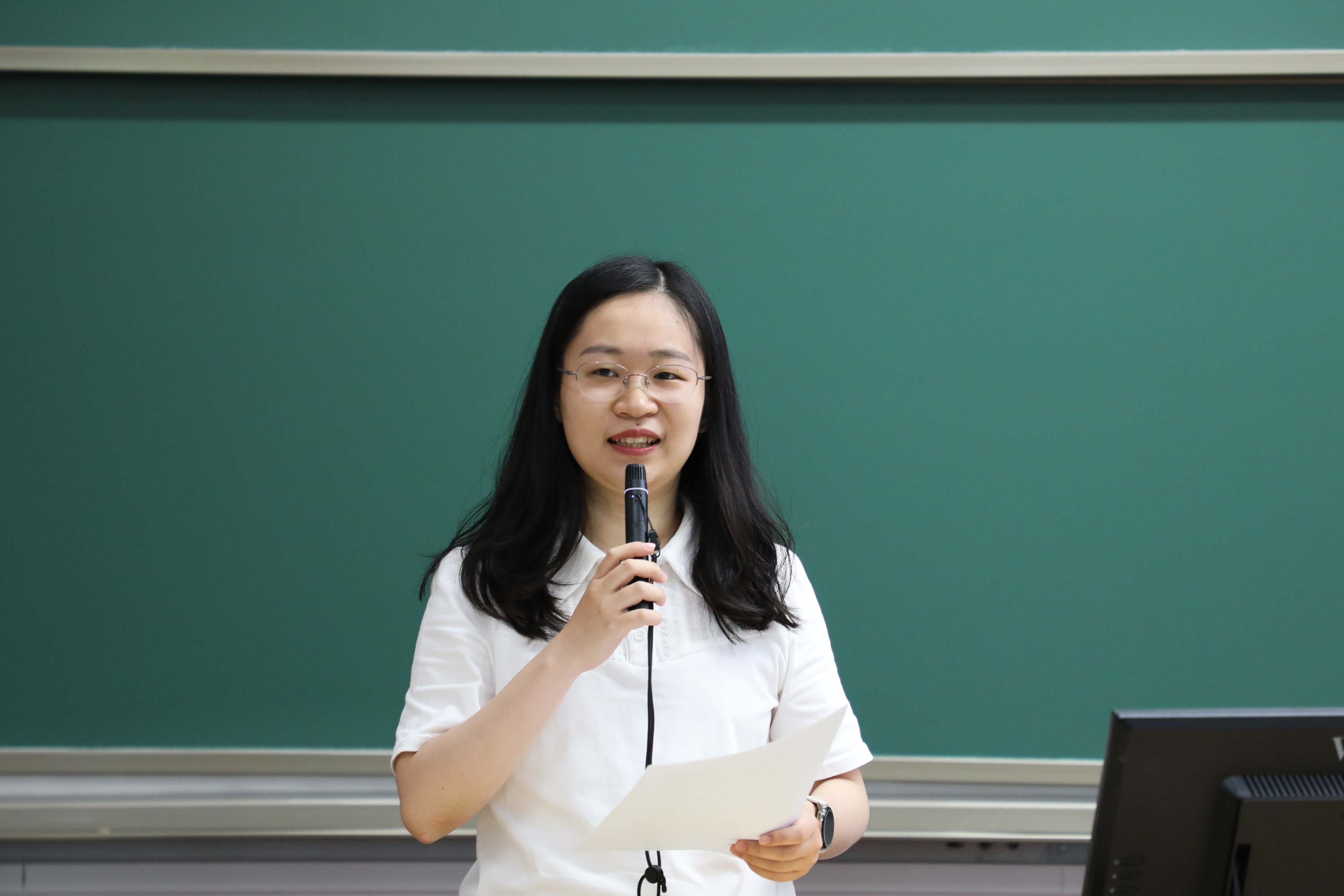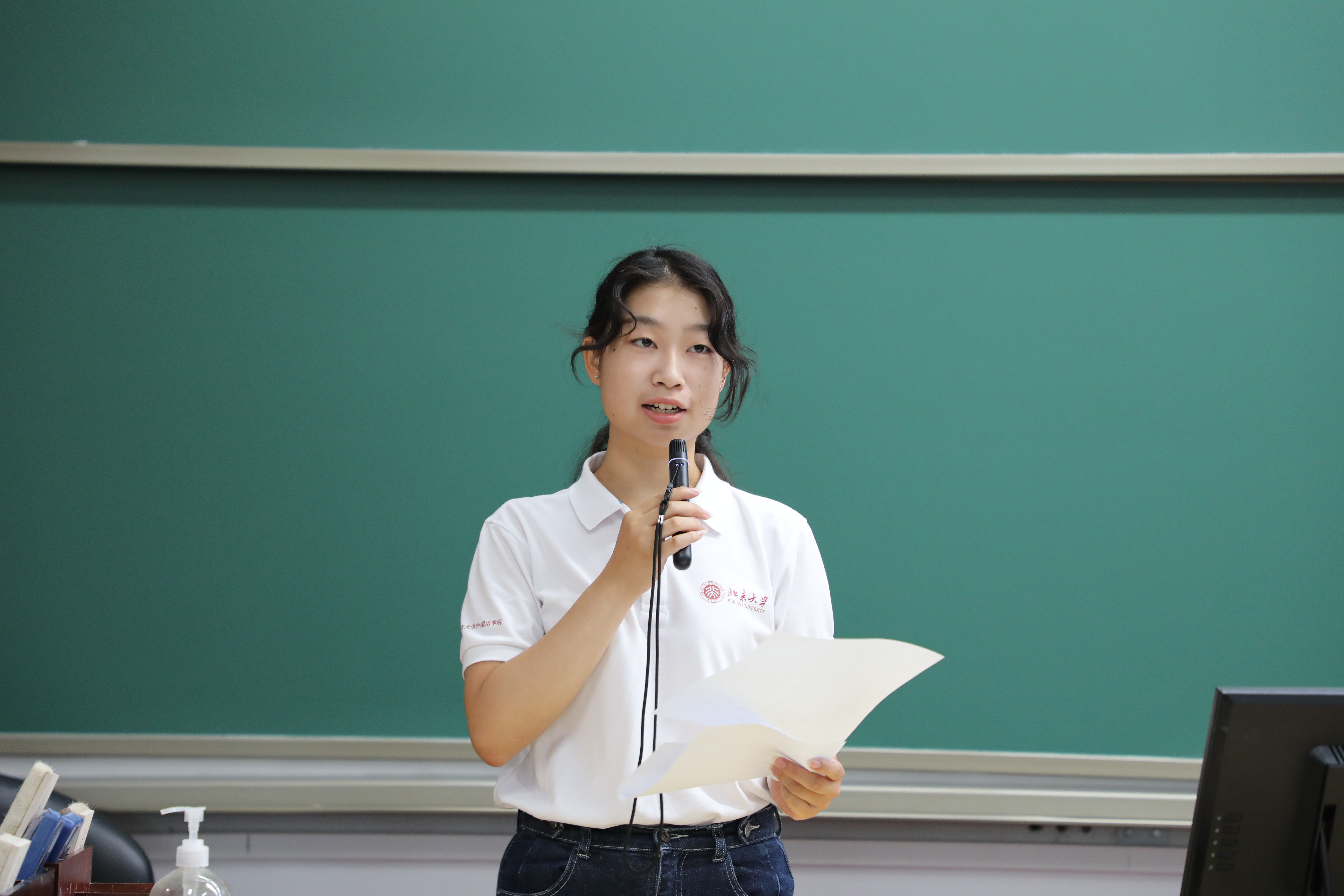 德语系助理教授黄超然作为军训领队教师代表发言。她分享了自己组织日评会的经验,总结了军训十天全程参训的收获,表达了作为领队老师对同学们积极参训态度的肯定与赞许,并希望同学们不负青春韶华,在北大学习的时光中辛勤耕耘,收获满满。