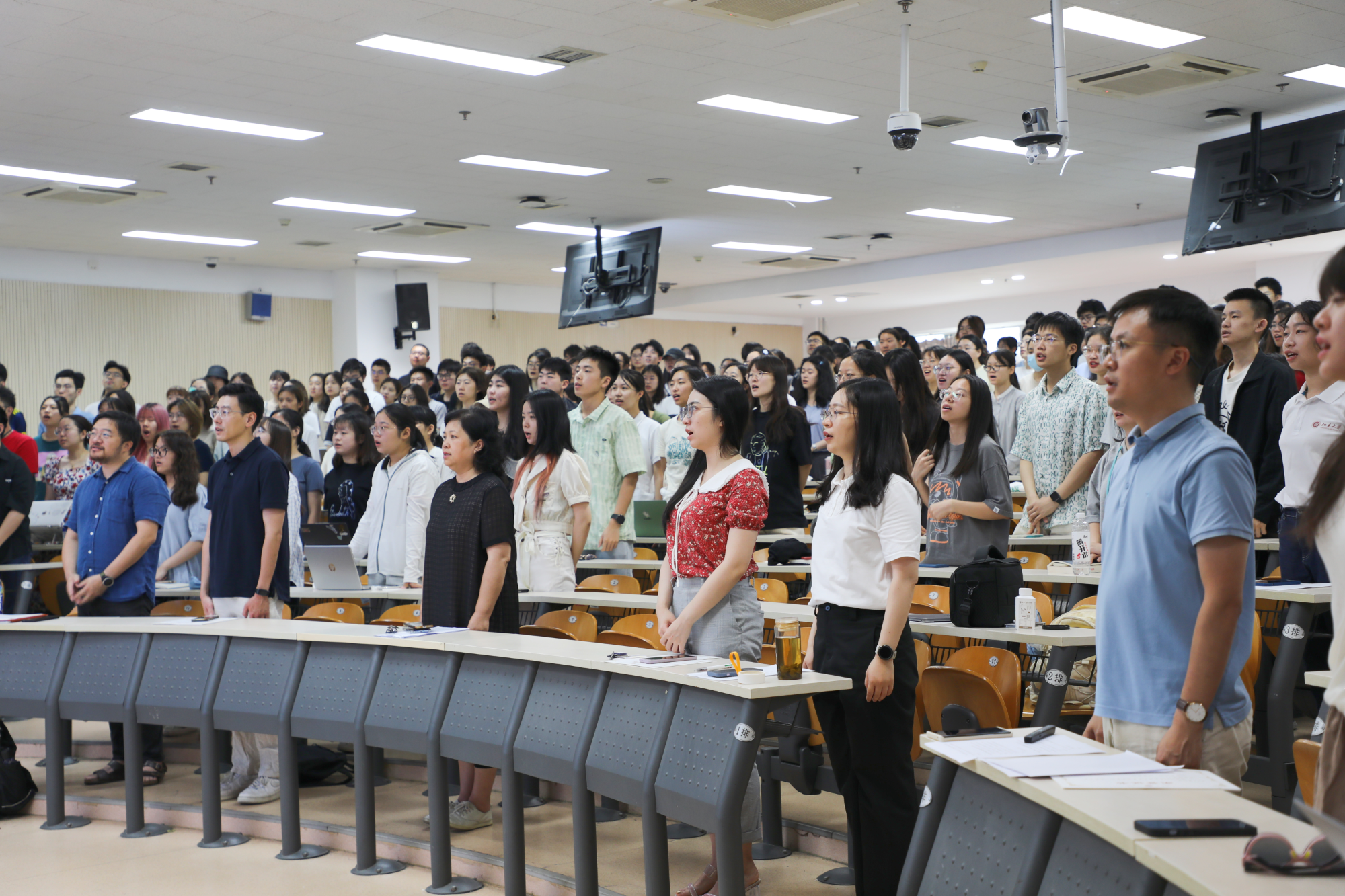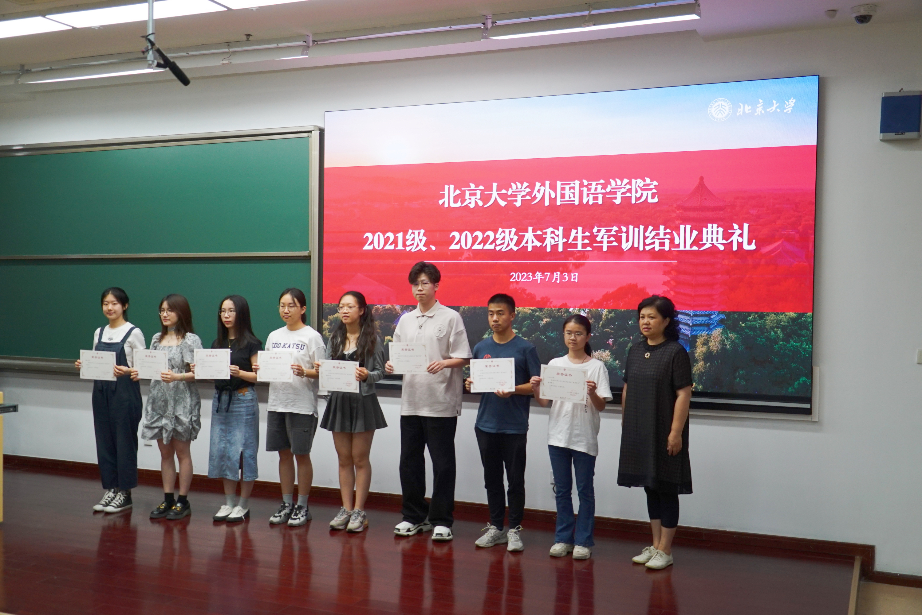 2023年7月3日上午,星空体育入口_星空(中国)体育网在理科教学楼208教室举办2021、2022级本科生军训结业典礼。星空体育入口_星空(中国)体育网党委书记李淑静,西葡意语系助理教授、十三连五班领队教师成沫,德语系助理教授、十三连一班领队教师黄超然,博士后、十二连一班领队教师孔雀,博士后、十三连六班领队教师王天驰,院办公室副主任、党委专职组织员、十二连二班领队教师冯一帆,团委书记伍昕钰,团委副书记、十三连三班领队教师杨轶佳,团委副书记、十三连四班领队教师杜姝格,团委副书记、十三连二班领队教师熊珊儿及星空体育入口_星空(中国)体育网2021、2022级全体参训学员出席仪式。典礼由星空体育入口_星空(中国)体育网党委副书记王恒主持。