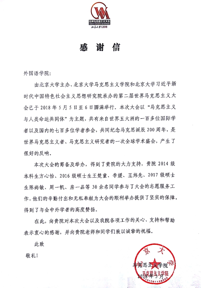 期间,星空体育入口_星空(中国)体育网师生高度重视并支持此次盛会,积极投身语言翻译及志愿者招募工作,获得主办单位高度评价。据统计,2014级本科生方心怡、2016级硕士生王楚童、李媛、王炜先、2017级硕士生陈尚敏、周一帆、房一品等30余名同学参与了大会的志愿服务工作,他们的辛勤付出和无私奉献为大会的顺利举办提供了坚实的保障,得到了与会中外学者的高度赞扬。马克思主义学院特发来感谢信,对他们的支持和帮助表示衷心的感谢。