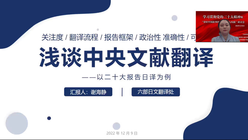 中央党史和文献研究院第六研究部日文翻译处处长谢海静以二十大报告日译文为例,分享了她对于中央文献翻译的认识。首先,她介绍了二十大报告的日文翻译流程,通过时事和数据展现了大众对中央文献日译文的高关注度。接着,她梳理了二十大报告的行文结构,强调把握全文结构、逻辑等对于中央文献翻译的重要性;结合“三个务必”“美好生活”等翻译实例阐释了中央文献翻译的第一要务,即政治性和准确性;从日本专家访谈、二十大现场听会感受等角度出发,介绍了日文翻译团队在译文可读性和讲好中国故事方面作出的努力。最后,谢海静指出中央文献翻译要多与社会、研究、实践相结合,并从外语水平、政治领悟力、尊重和热爱等方面对基地人才培养提出希望和期许。