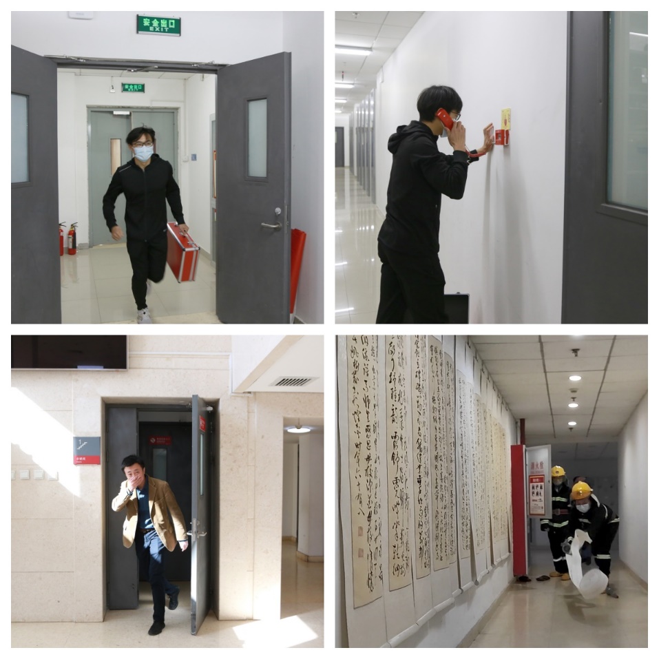 本次消防疏散演练以学院新楼地下二层开架书库突发火情为背景。中控室值班人员收到火灾报警信息,通过查看主机确定险情位置后,迅速携带应急包到现场确认火情,当发现火情无法控制后,即刻通过应急电话请求支援。值班人员接到报讯后即刻启动应急预案,并依次打开楼内应急广播和声光报警器。楼内疏散负责人迅速到位,有序组织楼内人员进行疏散。微型消防站人员携带装备迅速到达现场,其中2人展开水带,连接消火栓进行灭火,剩余人员查看有无被困人员,对现场展开搜救工作。