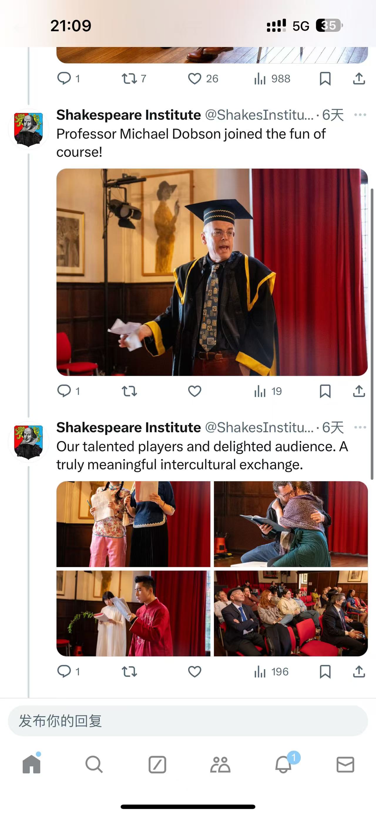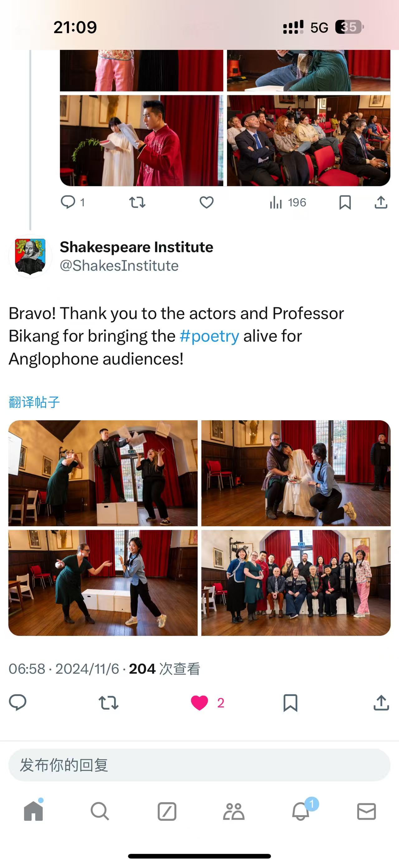 为了响应当今提倡文化交流、文明互鉴,向世界讲好中国故事的文化战略,星空体育入口_星空(中国)体育网英语系教授、中国外国文学学会莎士比亚研究分会会长黄必康老师,国际莎学大会学术咨询委员会委员、南京大学莎士比亚研究中心主任从丛教授于2024年11月2日至7日共同带领中国高校师生戏剧演出团队远赴莎士比亚的故乡斯特拉福,成功演出了一场时长80分钟的五幕英语诗剧《牡丹亭里的梦幻爱情》,受到参与观看的英国观众的盛赞。