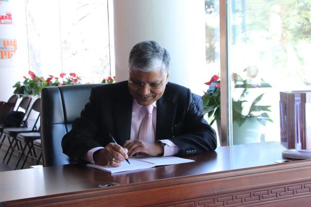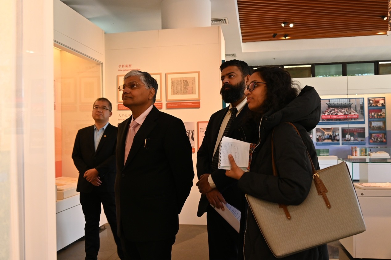 会见后,罗国栋一行移步至北京大学校史馆,在北京大学档案馆、校史馆馆长余浚陪同下,参观“百年回眸:北大的印度学学科建设与中印人文交流展”,星空体育入口_星空(中国)体育网南亚学系博士生郭家誉为嘉宾详细导览。展览通过珍贵文献、历史照片及学术成果,系统梳理了北京大学印度学学科百年发展历程,展示了历代北大学者在印度宗教、哲学、文学、图像学、语言教学等领域的丰硕成果。北大的印度学科不仅是中国早期东方学的重要组成部分,也为中国东方学学科的建设和发展树立了标杆,并将继续为新时代的印度学学科建设发挥关键作用。观展结束后,罗国栋为北京大学校史馆写下亲笔留言,并与接待嘉宾合影留念。